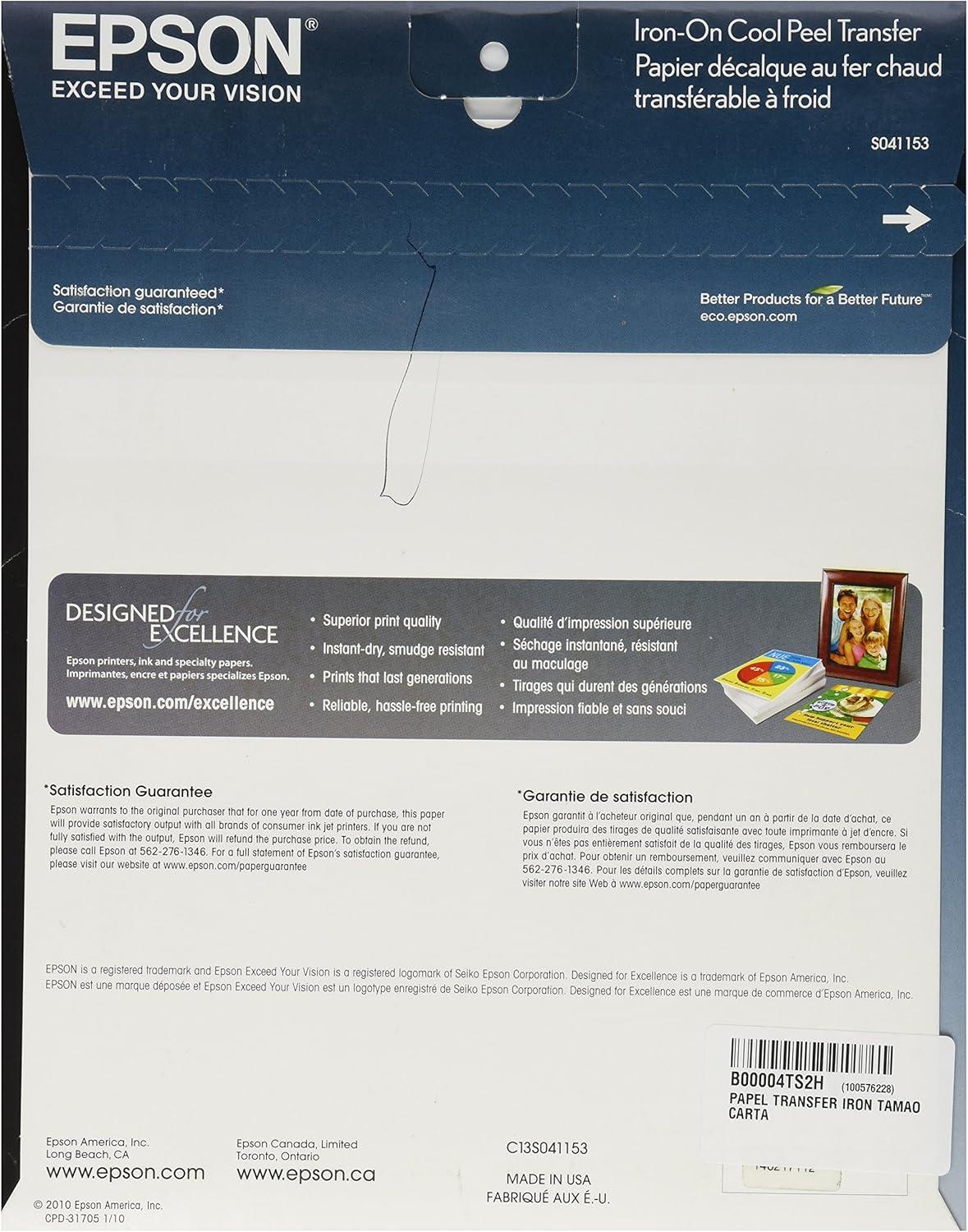 Epson Iron-on Cool Peel Transfer (8.5×11 Inches, 10 Sheets) (S041153),White