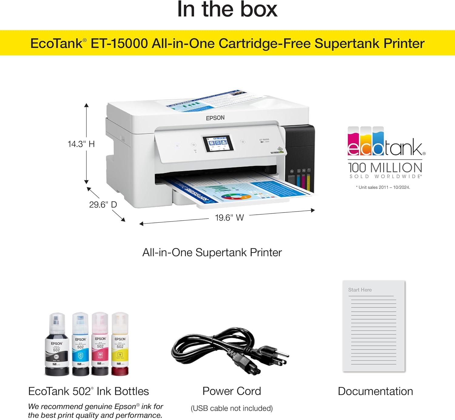 Epson EcoTank ET-15000 Wireless Color All-in-One Supertank Printer with Scanner, Copier, Fax, Ethernet and Printing up to 13 x 19 Inches, White(Printer)