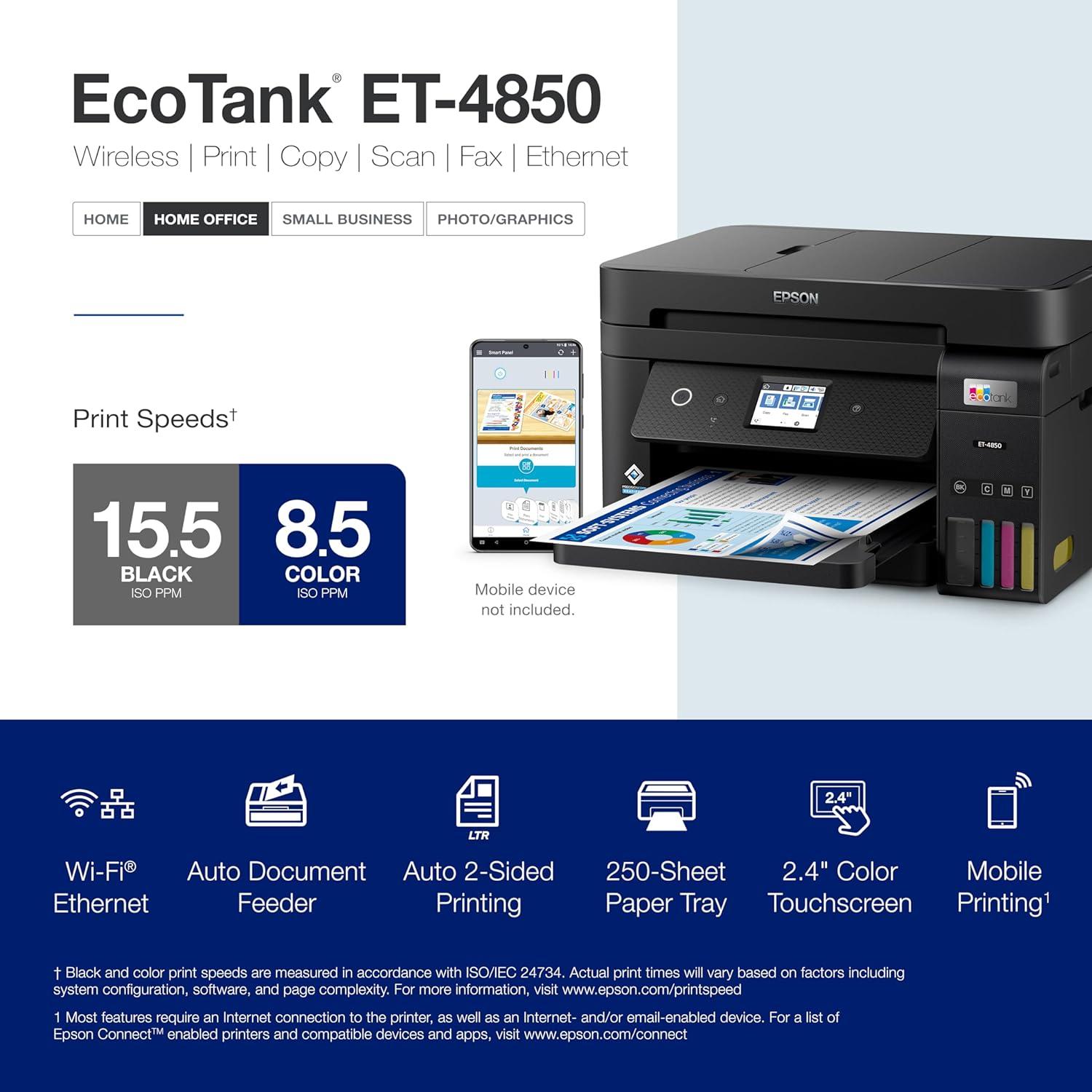 Epson EcoTank ET-4850 Wireless All-in-One Cartridge-Free Supertank Printer with Scanner, Copier, Fax, ADF and Ethernet – The Perfect Printer Office – White, Medium(ET-4850-B)