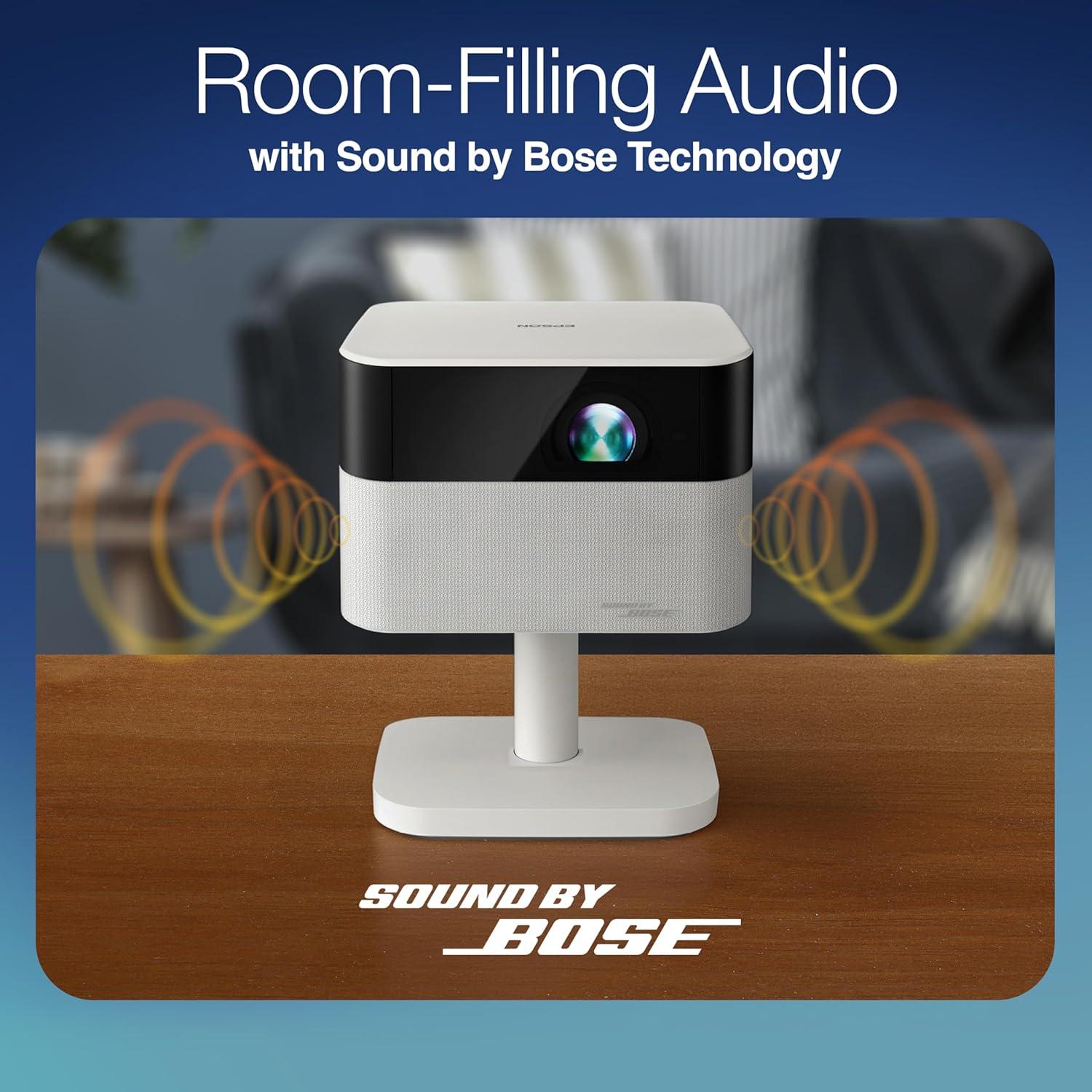 Epson Lifestudio Flex Full HD Portable Lifestyle Projector, 700 Lumens of Color and White Brightness, Sound by Bose, Epson Projection Studio App, Stand, Google TV, 3-Chip 3LCD Triple Core Engine