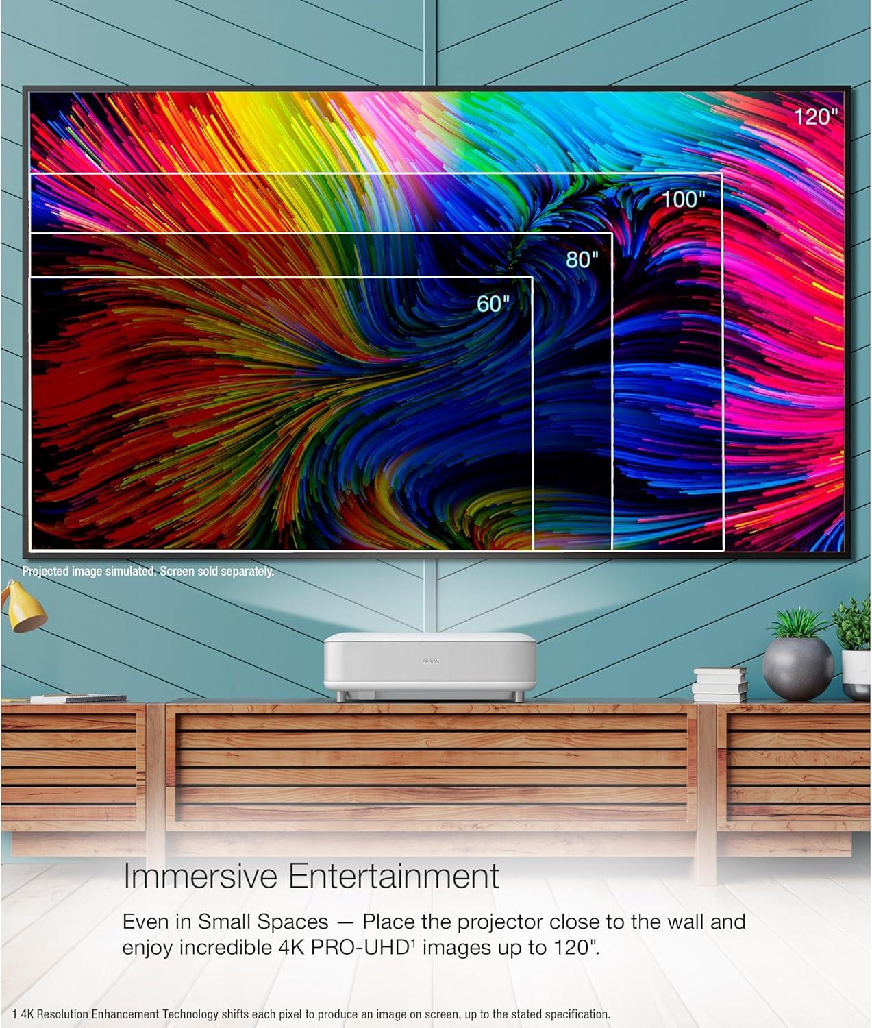 Epson EpiqVision Ultra LS800 Ultra Short Throw 3-Chip 3LCD Smart Streaming Laser Projector, 4,000 Lumens, 4K PRO-UHD, HDR, 150″ Class, Android TV, 2.1ch Yamaha Built-in Speakers – White (Renewed)