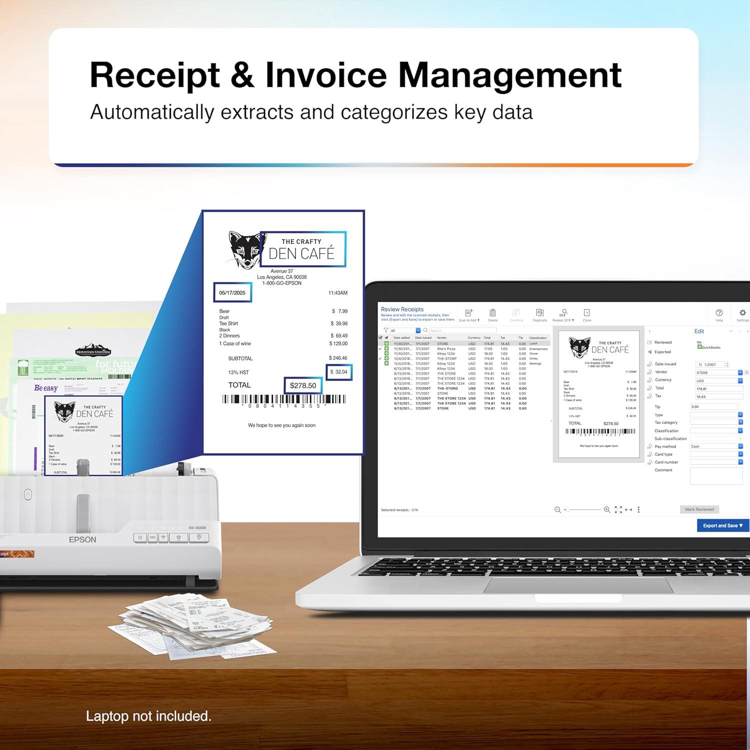 Epson RapidReceipt RR-400W Wireless Compact Desktop Color 2-Sided Receipt & Document Scanner with ScanSmart AI PRO Receipt Management & PDF Software & 20-Page Auto Document Feeder