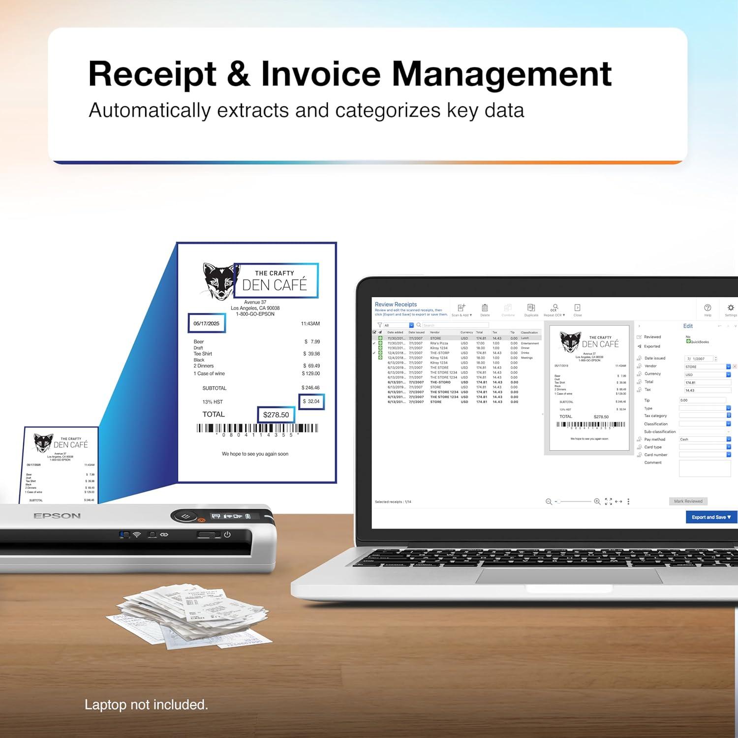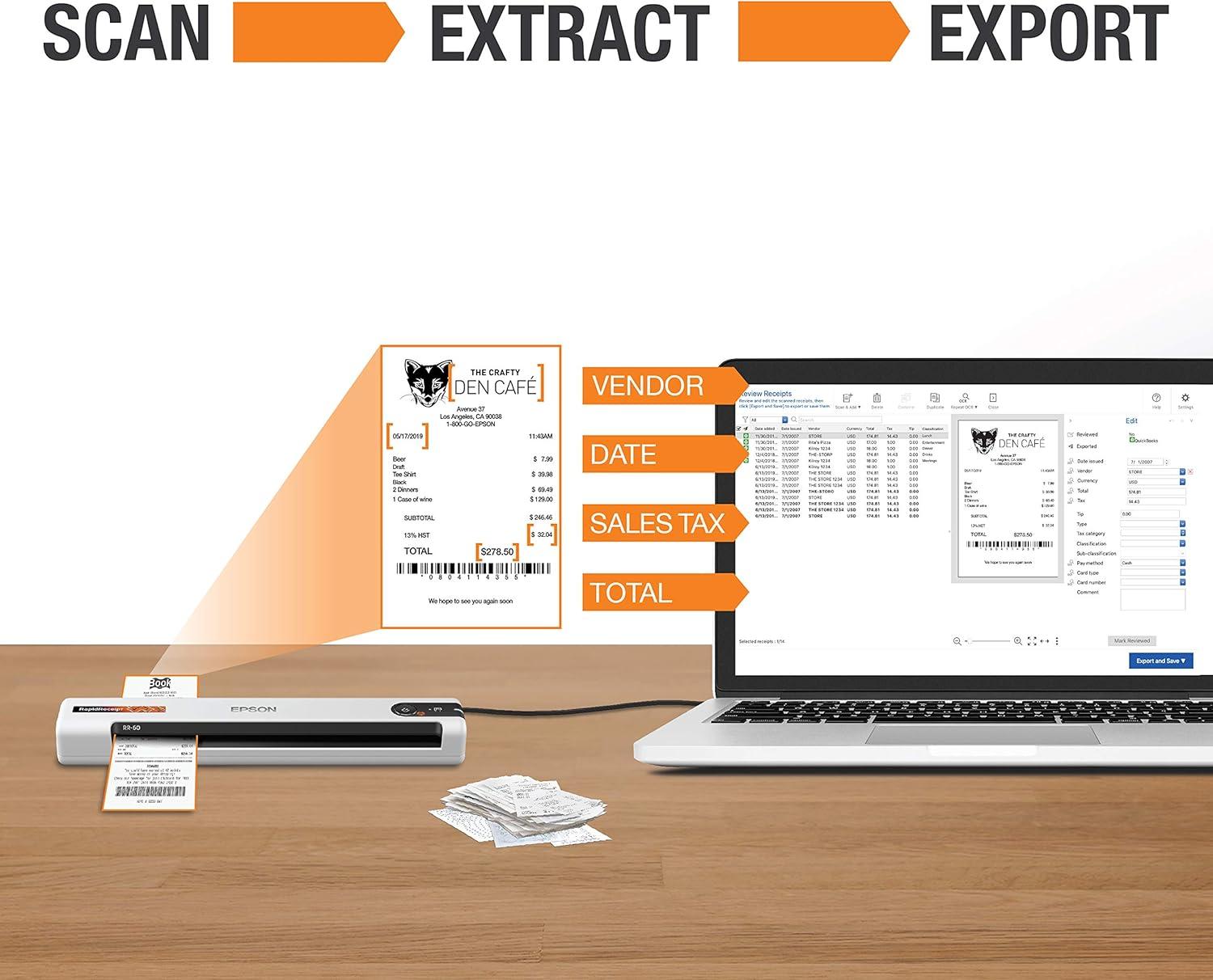 Epson RapidReceipt RR-60 Mobile Color Receipt & Document Scanner with ScanSmart AI PRO Receipt Management & PDF Software for PC & Mac(RR-60 – Renewed)