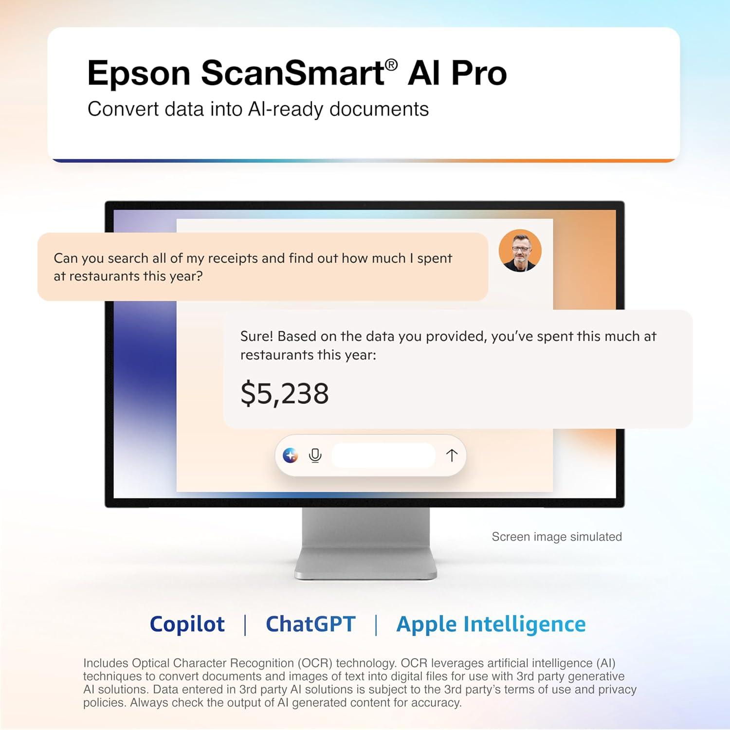 Epson RapidReceipt RR-600W Wireless Desktop Color 2-Sided Receipt & Document Scanner with ScanSmart AI PRO Receipt Management & PDF Software for PC & Mac, Touchscreen & 100-Page Auto Document Feeder