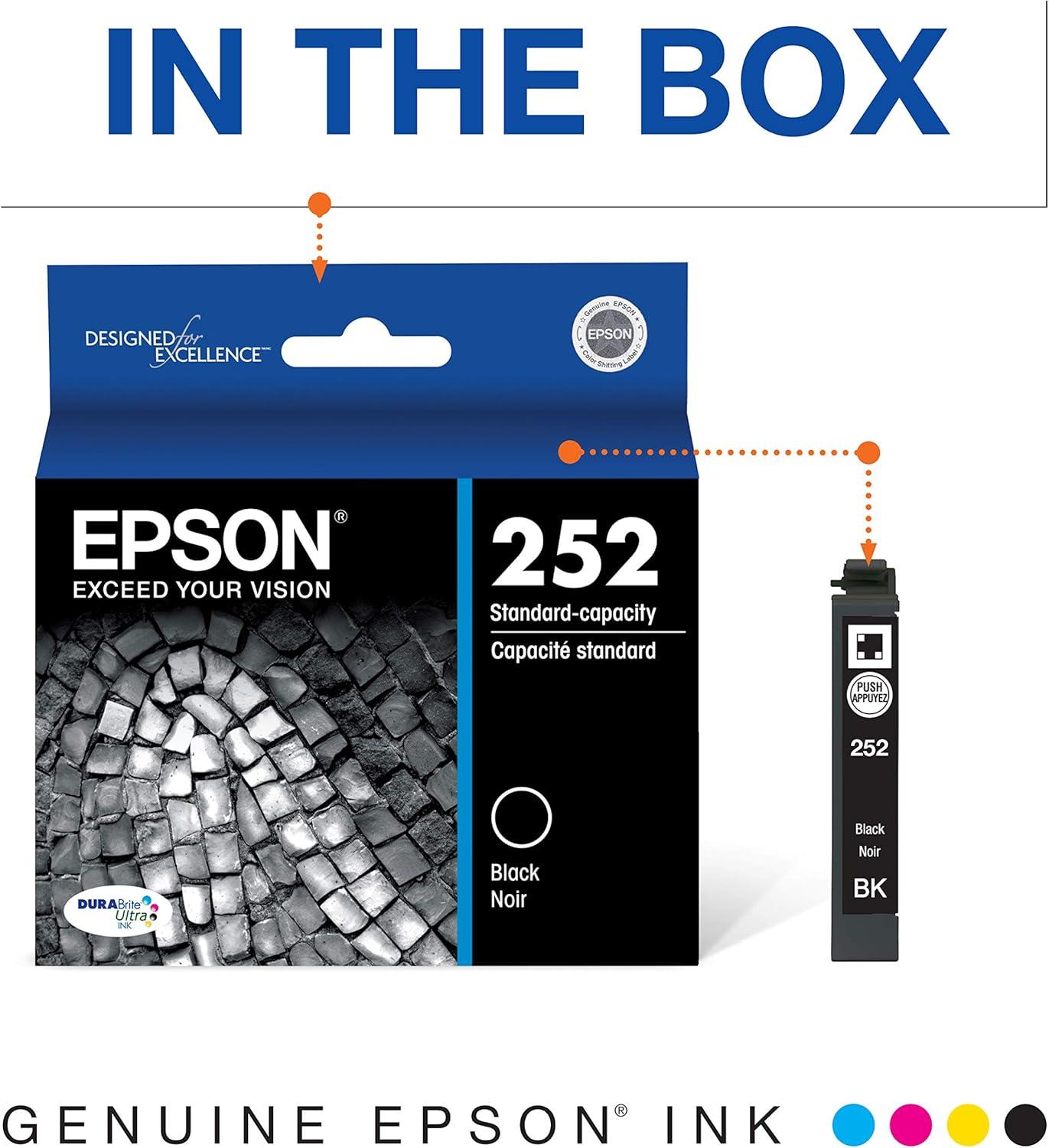 Includes Epson DURABrite Ultra Ink color combo pack (T252520-S) and black cartridge (T252120-S) designed for WF series printers.