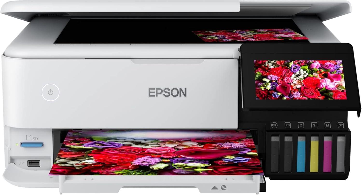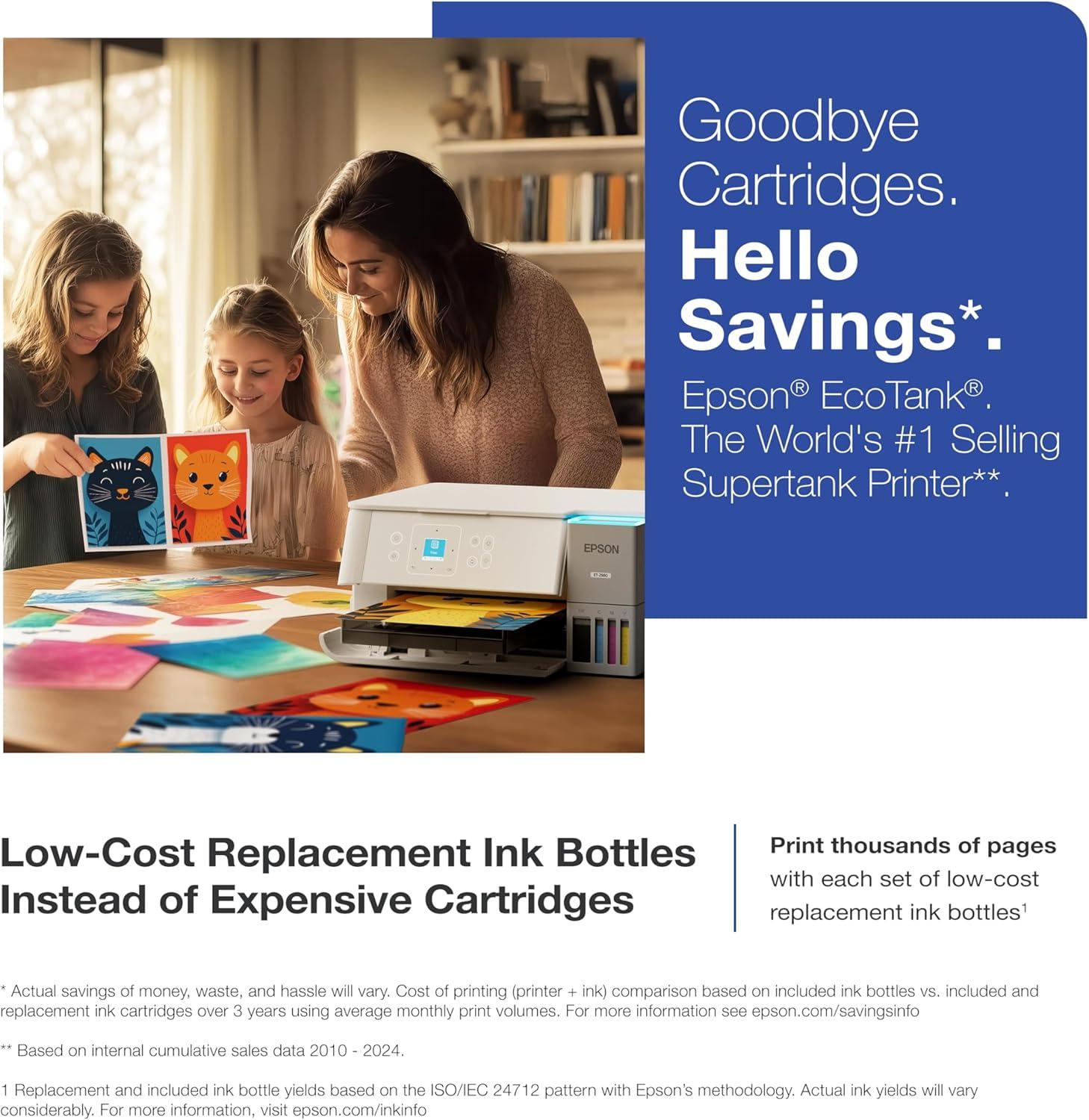 Epson strongly recommends the use of genuine ink to ensure optimal print quality and performance. Use of non-genuine ink could cause damage not covered under the printer’s ltd. wnty. | 1. Actual savings and costs will vary considerably based on print tasks, print volumes and usage conditions. Savings and cost per ISO page are based on the cost of replacement ink bottles and the cost of enough standard cartridges to achieve the total page yields of the bottles using the MSRP (USD) and yields for Epson standard-capacity ink cartridges for similarly featured Epson consumer inkjet printers as of March 2024. | 2. Individual cartridges estimate based on print yields of an included or replacement set of black and color ink bottles as compared to Epson standard-capacity ink cartridges for similarly featured printers as of March 2024. | 3. Part of the ink from the included bottles is used for initial setup; yields are lower than those of replacement ink bottles. Replacement and included ink bottle yields based on the ISO/IEC 24712 pattern with Epson’s methodology. Actual ink yields will vary considerably for reasons including images printed, print settings, temperature and humidity. Yields may be lower when printing infrequently or predominantly with one ink color. All ink colors are used for printing and printer maintenance, and all colors must be available for printing. For more information, visit www.epson.com/inkinfo | 4. Based on average monthly document print volumes of about 200 pages. | 5. See www.epson.com/voice for device compatibility. Epson Connect account and voice-activated account registration required. | 6. Most features require an Internet connection to the printer, as well as an Internet- and/or email-enabled device. For a list of Epson Connect enabled printers and compatible devices and apps, visit www.epson.com/connect | 7. Requires Epson Smart Panel app download. Data usage fees may apply.