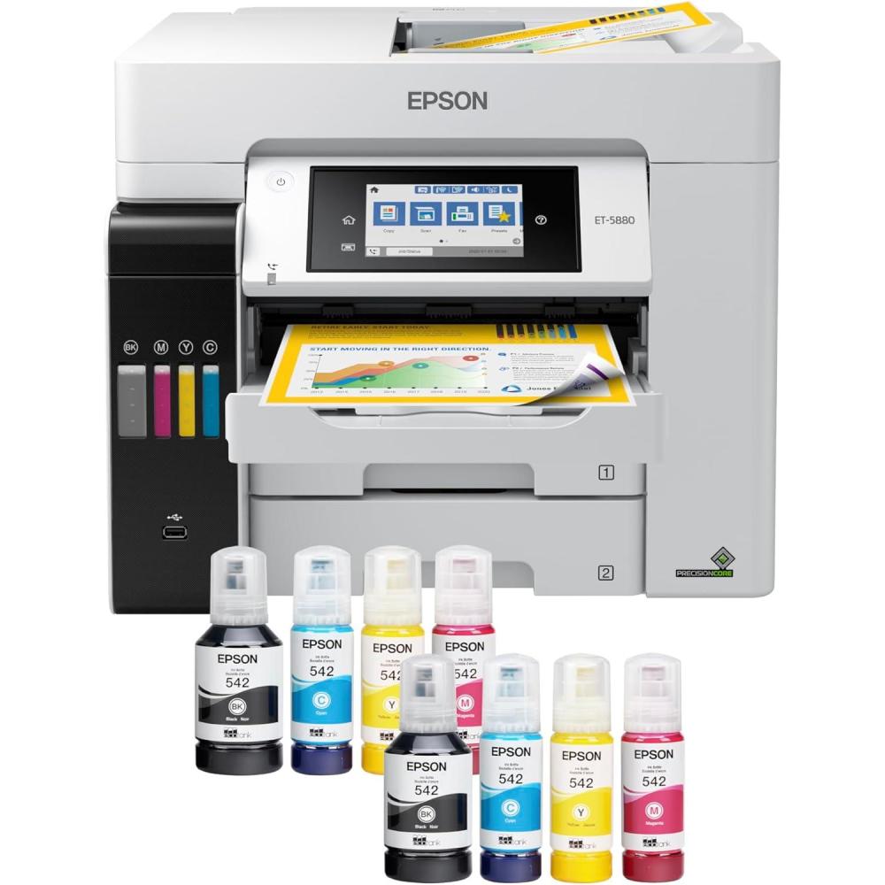 The EcoTank Pro ET-5800 wireless all-in-one offers fast Cartridge-Free Printing with easy-to-fill supersized ink tanks. You can save up to 80 percent with low-cost replacement ink bottles vs. standard-capacity color laser toner cartridges (1) – about 2 cents per color ISO page versus 14 cents with cartridges (1). PrecisionCore Heat-Free Technology delivers high-volume, print-shop-quality output, plus speeds up to 25 ISO ppm black (ƚ). This all-in-one with Epson DURABrite pigment-based ink delivers vibrant borderless prints up to 8.5″ x 14″. Each replacement ink set includes enough ink to print up to 6,000 pages (2). Plus, there’s zero cartridge waste and very low energy consumption (3). The ET-5800 features two 250-sheet front paper trays and a rear specialty-paper feed, plus a 4.3″ color touchscreen and hands-free voice-activated printing (4). *The NPD Group, Total Channel Tracking Service, U.S. & Canada, Inkjet SF/MF Printers, Refillable ink tank included, based on units, February 2019 – January 2020. Supertank printers are defined as refillable ink tank printers. **2 Years of Unlimited Ink promo valid for ET-5150, ET-5170, ET-5180, ET-5800, ET-5850, ET-5880, ET-16600 or ET-16650 printers purchased from 10/1/2021 to 3/31/2025. Product must be registered within 30 days of purchase. Limit four 542 ink bottles per claim. Each claim cannot contain multiple bottles of the same color. Retain your empty 542 ink bottle for submission along with rebate form. Promotion applies to ink only. Printer covered by Epson 2-year ltd wnty with registration. For promo participation, you must register your product. See manufacturer's website for details. Ƚ Black print speeds are measured in accordance with ISO/IEC 24734. Actual print times will vary based on factors including system configuration, software, and page complexity. 1. Actual savings and costs will vary considerably based on print tasks, print volumes and usage conditions. Savings and cost per ISO page are based on the cost of replacement ink bottles and the cost of enough standard-capacity color laser toner cartridges to achieve the total page yields of the ink bottles using the manufacturers' online prices and yields for the best-selling similarly featured color laser printers, available at retail, priced at $999 or less (USD) with speeds of 40 ppm or less per industry-available data as of July 2019. Savings of up to $600 (USD) and cost per ISO page of about $0.09 (USD) for XL-capacity color laser toner cartridges based on the same methodology. 2. Part of the ink from the included bottles is used for initial setup; yields are lower than those of replacement ink bottles. Replacement and included ink bottle yields based on the ISO/IEC 24712 pattern with Epson’s methodology. Actual ink yields will vary considerably for reasons including images printed, print settings, temperature and humidity. Yields may be lower when printing infrequently or predominantly with one ink color. All ink colors are used for printing and printer maintenance, and all colors must be available for printing. 3. Based on comparing manufacturers’ reported TEC values of the best-selling, similarly featured color laser printers priced about $999 (USD) or less with print speeds of 40 ppm or less as of July 2019. 4. Epson Connect account and voice-activated account registration required. 5. Most features require an Internet connection to the printer, as well as an Internet- and/or email-enabled device. 6. Wi-Fi CERTIFIED; level of performance subject to the range of the router being used. Wi-Fi Direct may require printer software. 7. 12 months of standard limited warranty or 80,000 plain paper sheets (whichever happens first). For an additional 12-month extended service plan (total of 24 months or 80,000 plain paper sheets, whichever happens first), register your product and use Epson genuine ink bottles. See Limited Warranty for details. 8. SmartWay is an innovative partnership of the U.S. Environmental Protection Agency that reduces greenhouse gases and other air pollutants and improves fuel efficiency.